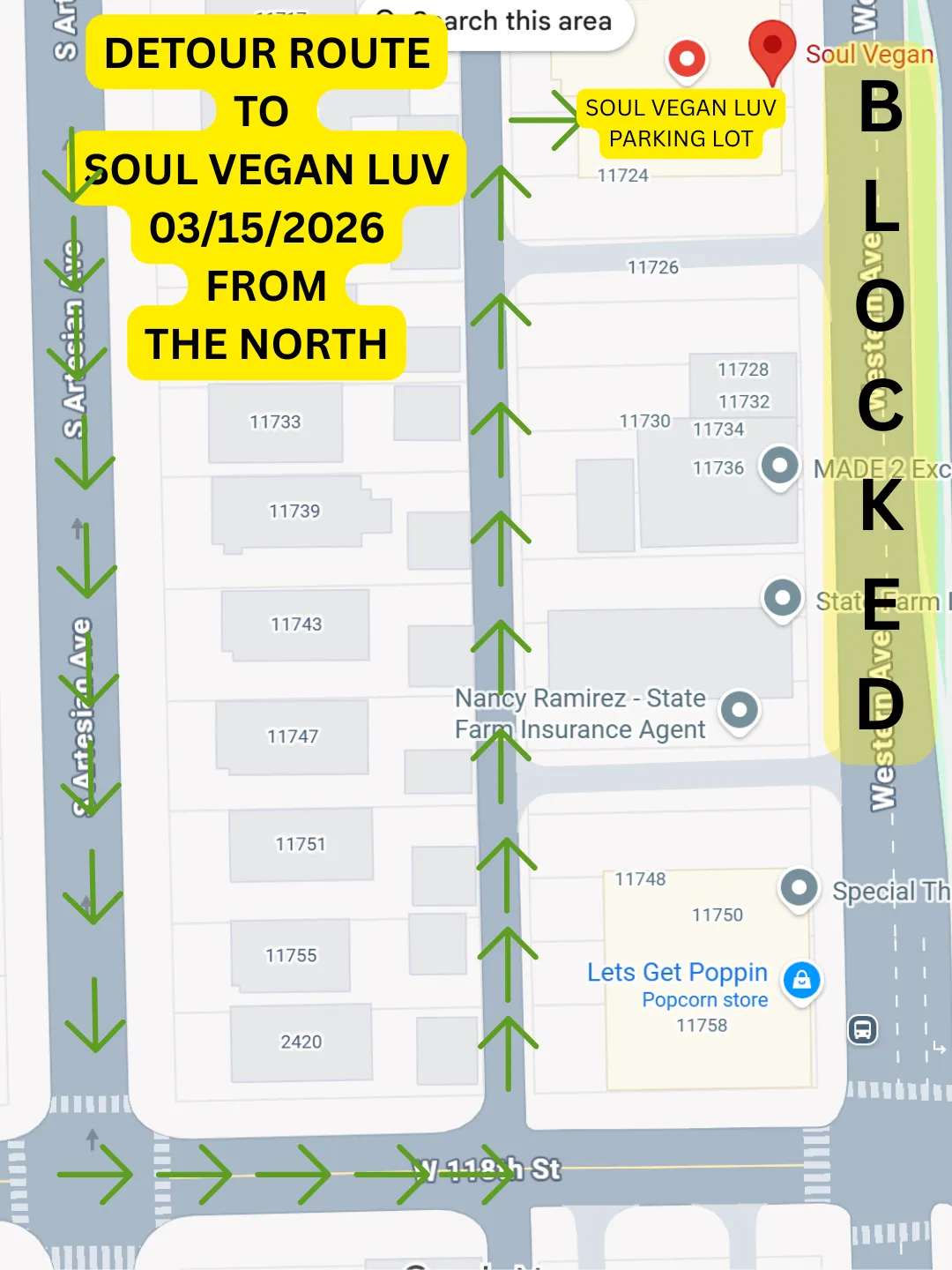 come down South Artesian and at 118th or 120th which ever is open take the alley way to 117th and look for the entrance to Soul Vegan Luv parking lot